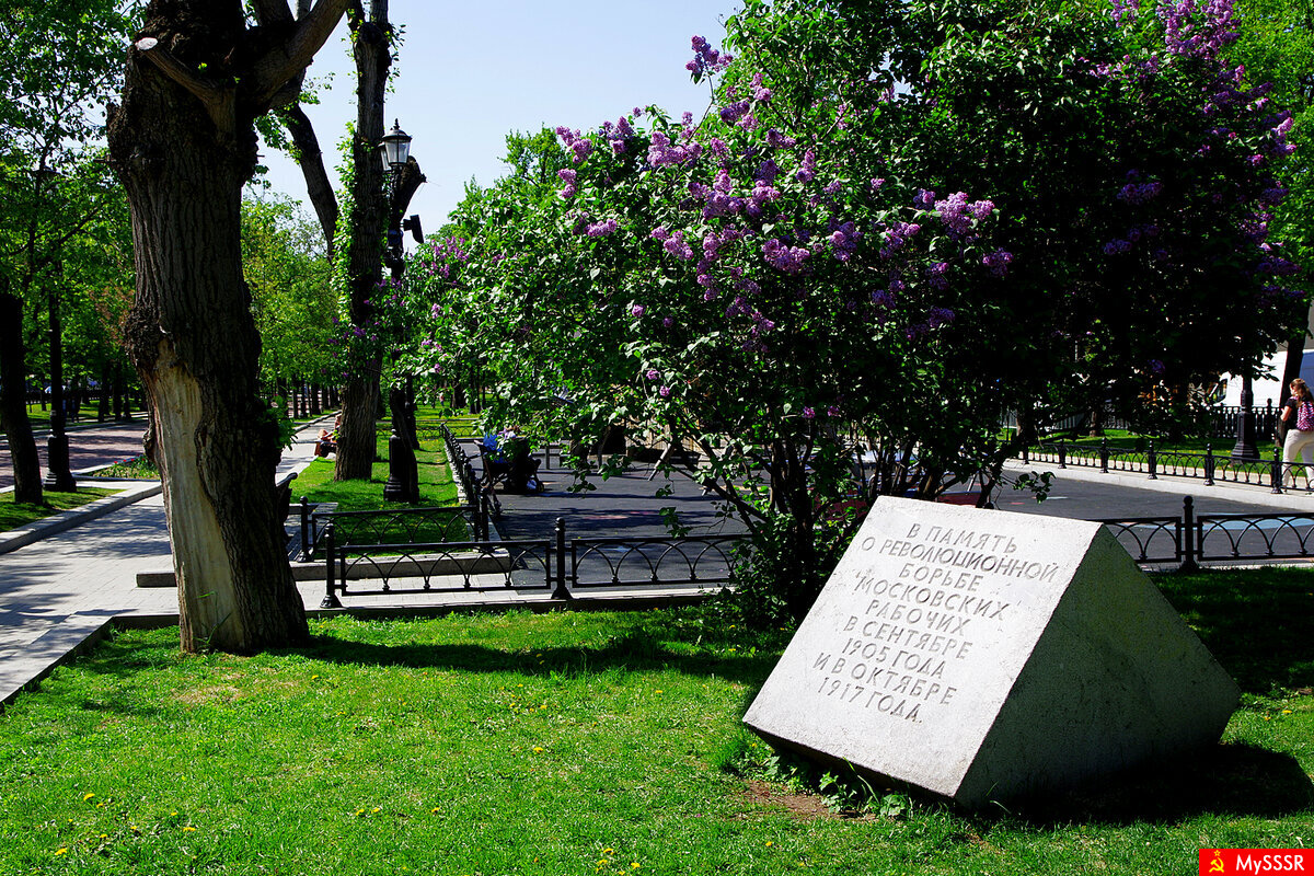 Мемориальная доска "В память о революционной борьбе московских рабочих в сентябре 190 года и в октябре 1917 года" на Тверском бульваре в Москве. Май 2023.