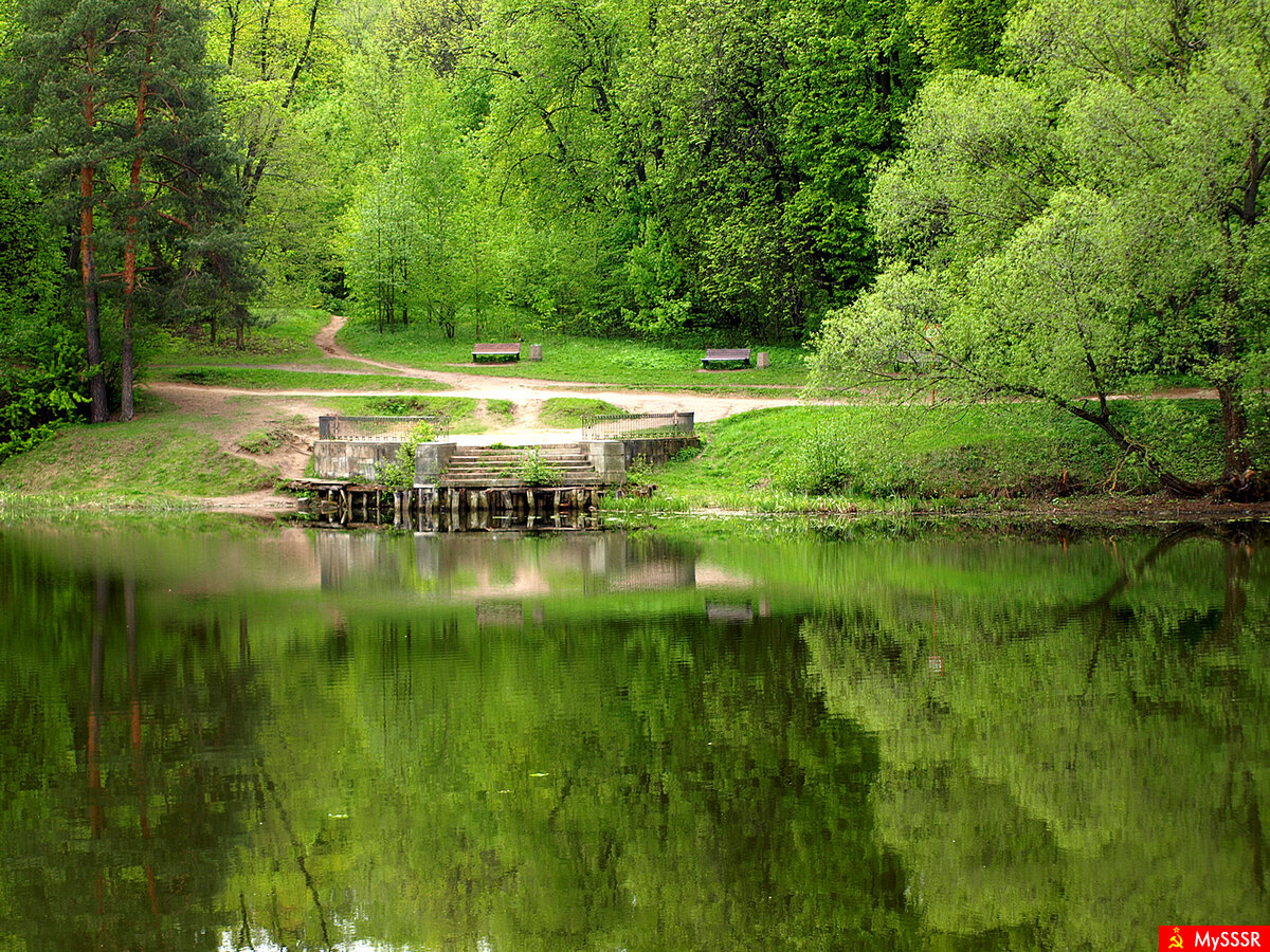 Круглая пристань на Верхнем Кузьминском пруду в Кузьминском парке в Москве. Май 2024.