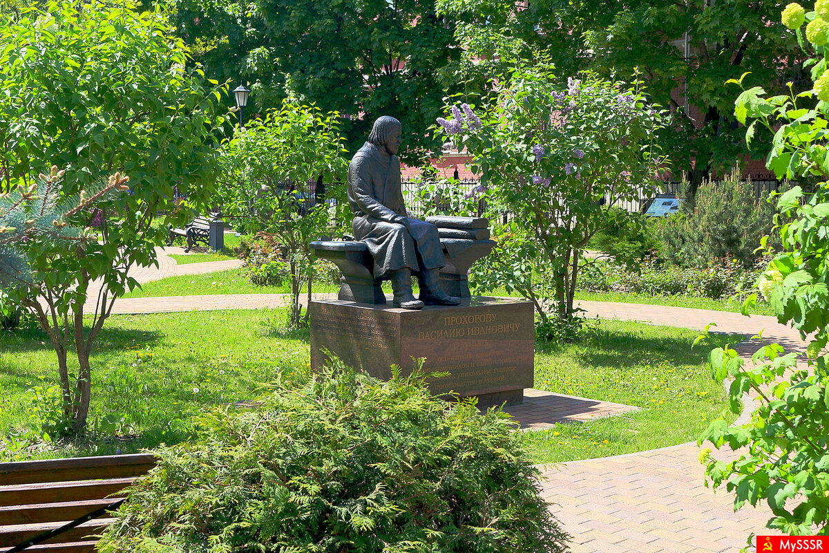 Сквер Промышленников Прохоровых в Большом Предтеченском переулке в Москве. Май 2024. Памятник Прохорову Василию Ивановичу (1755-1815) основателю династии промышленников и благотворителей, создавших уникальное ткацкое производство в России. Монумент сооружён в 2015 году по инициативе жителей, активном участии местных органов власти, духовенства и финансовой поддержке ОАО "Трёхгорная мануфактура". Скульптор Смирнов Л.А.
